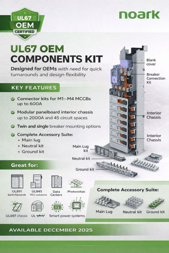 NOARK Electric’s new UL67 OEM Components Kit is designed for fast turnarounds, modular design flexibility, and simplified panelboard and switchboard builds. The kits are UL67 tested and support a wide range of industrial and commercial applications, including UL891 switchboards, UL845 MCCs, data centers, PV systems, and smart power infrastructure.